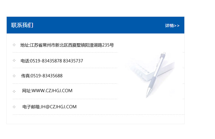 地址:常州市新北區友邦商務大廈1幢16、17層  電話:0519-85101652  傳真:0519-85112595  郵編:213022  網址:www.cz-jiayue_cn.jthyjz.com  郵箱:xiajifengaa@163.com